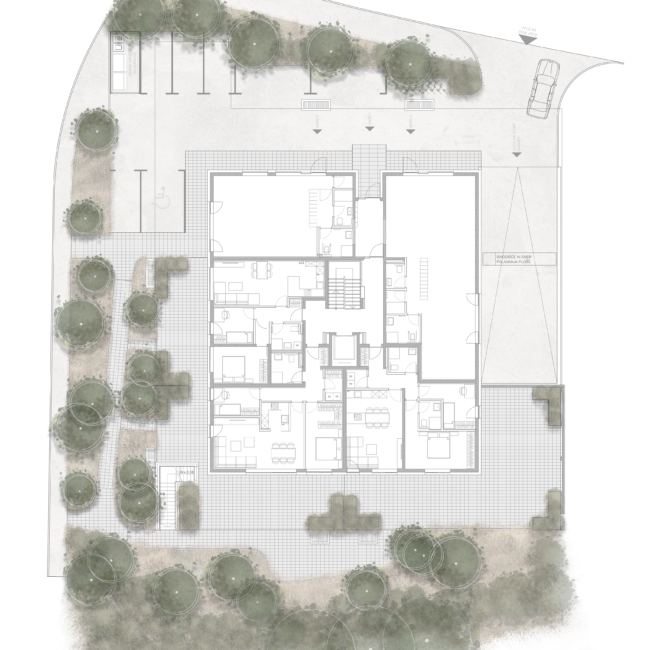 Bivalna terasa z letno kuhinjo je umeščena v severni del zemljišča. Senčimo jo z bioklimatsko pergolo in avtohtono vzpenjalko. Zasaditev je pestra in bujna, izbor rastlin pa prilagojen podnemnim in rastnim razmeram. Vrt, ki ima vse kar potrebuješ.