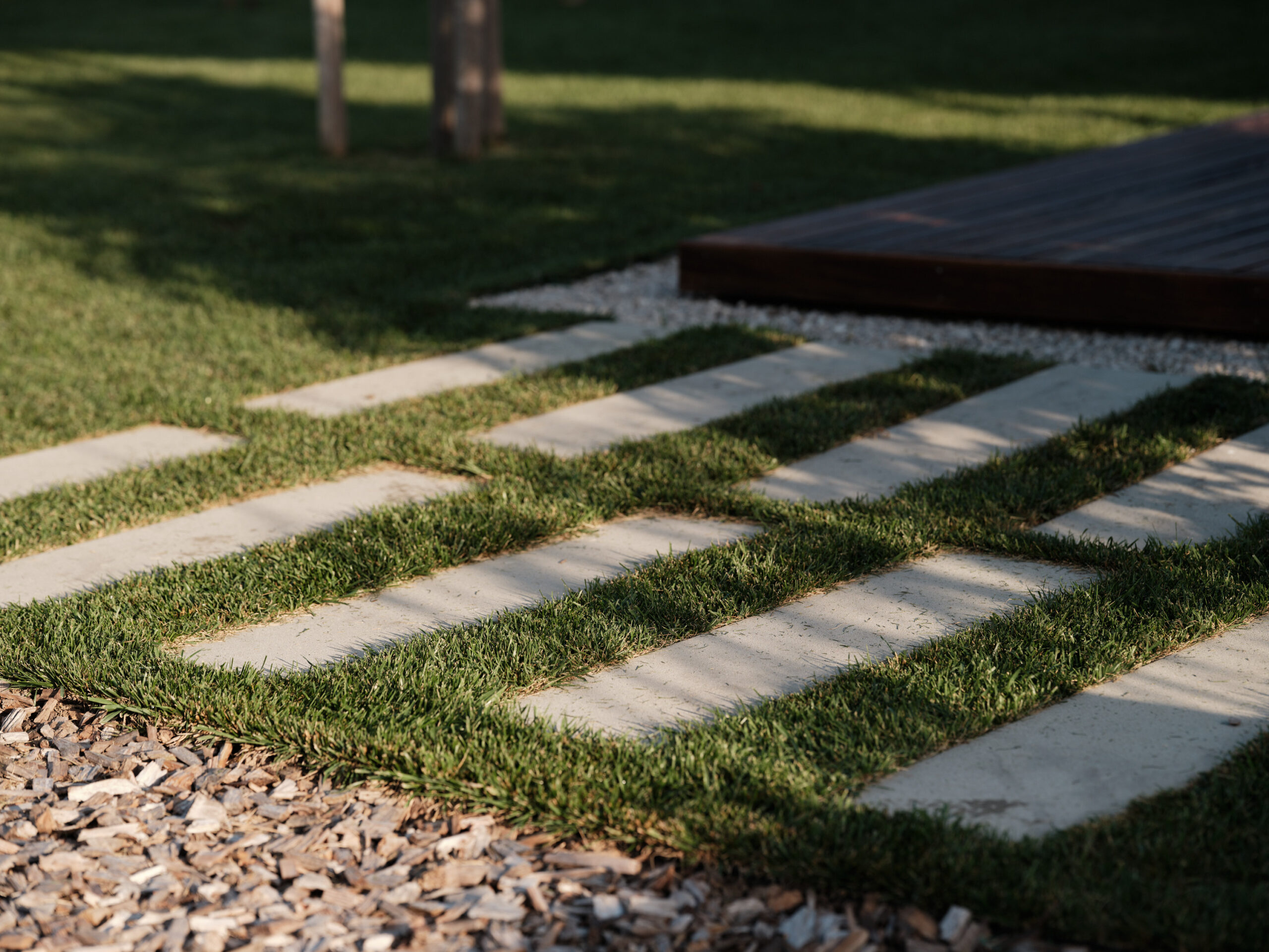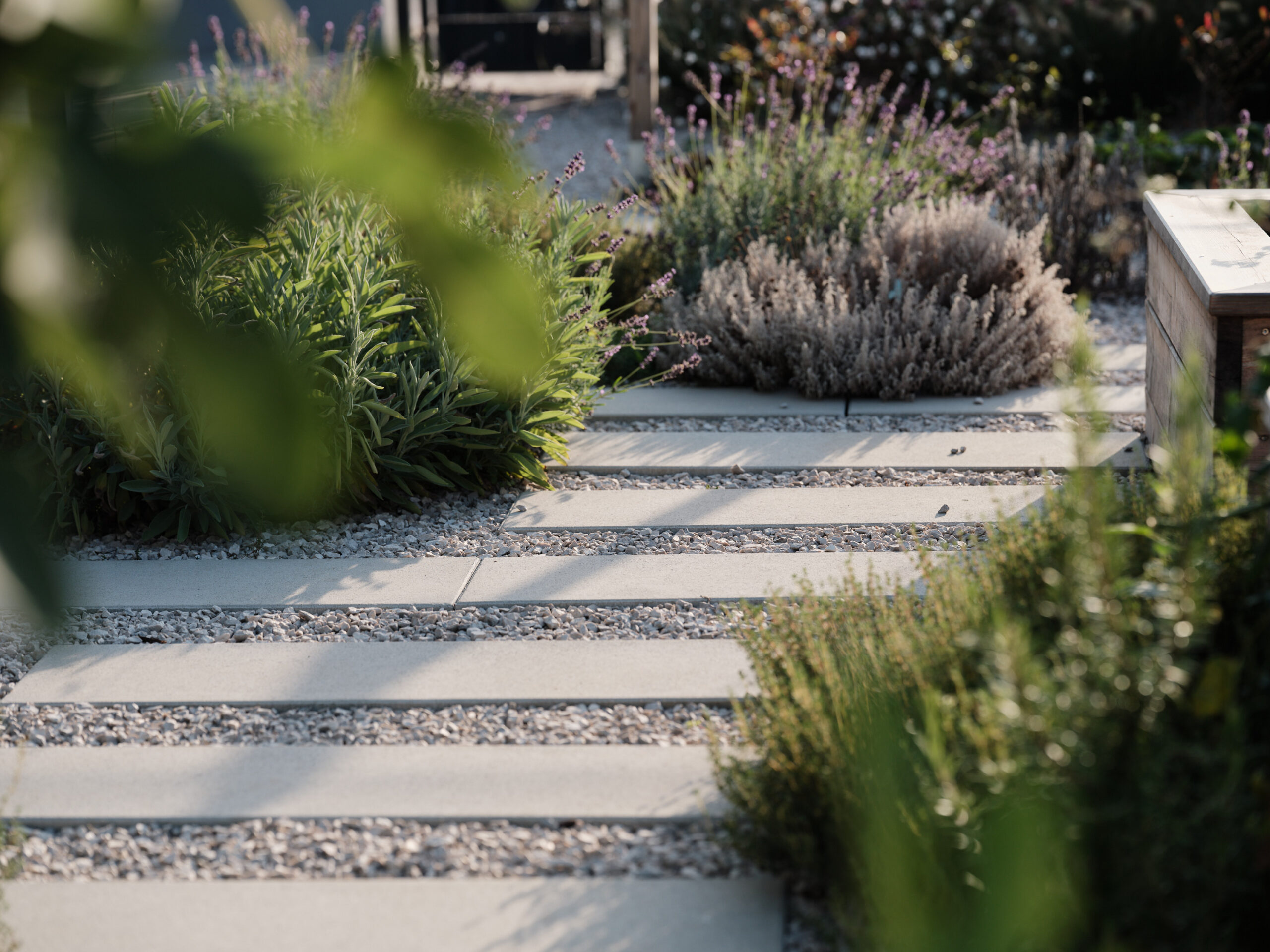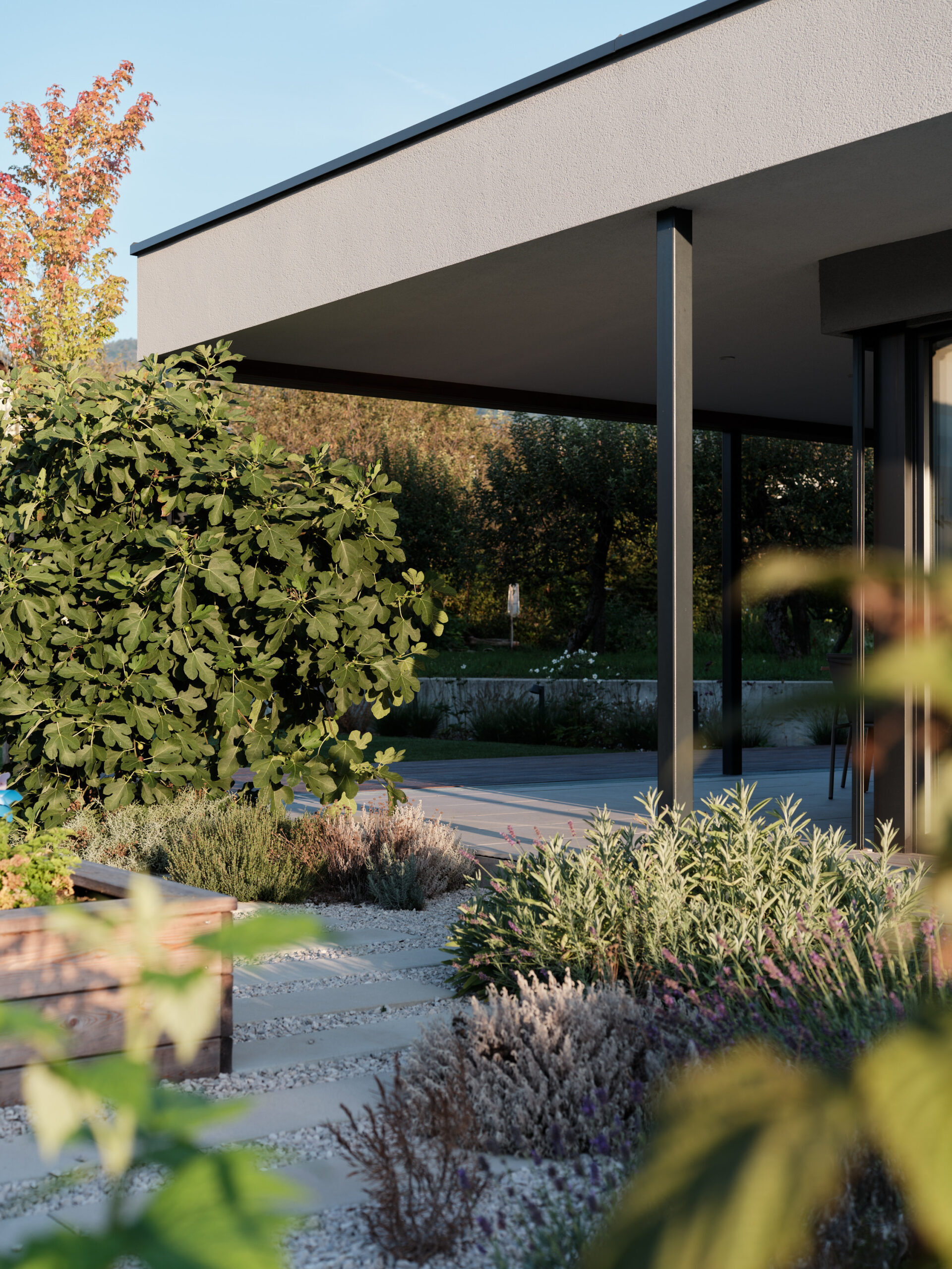 Vrt ob enodružinski hiši je raven vrt. Preprost v svoji oblikovnosti, vendar skrajno funkcionalen. Prepoznaven element v vrtu so stopalne plošče, ki povezujejo in členijo ter leseni, drsni brisoleji, ki bivalno teraso po potrebi zakrivajo in senčijo. Grede medovitih trajnic, dišavnic in okrasnih trav s svojo mehkobo tvorijo kontrast strogi geometrijski zasnovi.