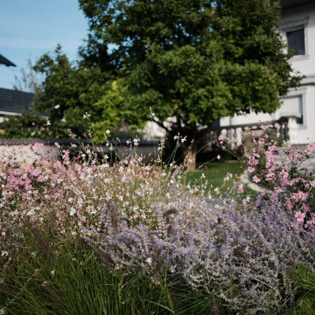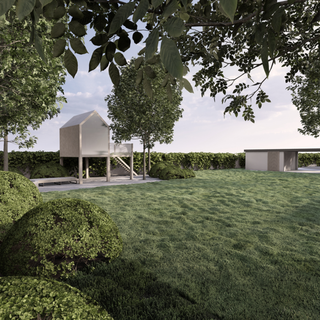 Obsežen vrt enodružinske hiše je oblikovan tako, da se grajen in odprt – zeleni postor dopolnjujeta. Vrt predstavlja podaljšek interierja. Preko nadkrite bivalne terase z letno kuhinjo se odpira v večplastno oblikovan odprt prostor. Osrednji element predstavlja stopnišče, ki povezuje posamezna platoja, hrati pa predstvlja družabno vozlišče. Izbrane rastline so nezahtevne za nego in ustvarjajo privlačno podobo skozi vse letne čase.
